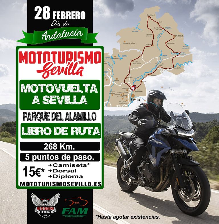 Ruta en moto de unos 250Km. por la provincia, con salida y meta en Sevilla siguiendo el libro de ruta facilitado por la organización.